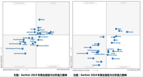 那麼,在過去的這一年,全球商業智能與分析市場的變革發展到什麼地步了?首先,讓我們對比一下Gartner分別在 2015年和2016年公布的商業智能與分析魔力象限。