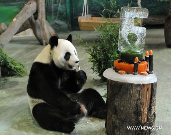 Giant panda Yuanyuan eats a special birthday cake at the zoo in Taipei, southeast China's Taiwan, Aug. 29, 2010. People celebrated the upcoming 6th birthdays for giant pandas Tuantuan and Yuanyuan on Sunday. Yuanyuan and Tuantuan were born on Aug. 30 and Sept. 1 respectively. (Xinhua/Wu Ching-teng) |