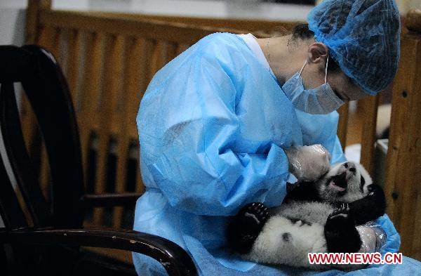 Ashley Robertson fondles a baby panda to help it defecate in Chengdu Panda Base in Chengdu, capital of southwest China's Sichuan Province, Oct. 19, 2010. (Xinhua/Li Qiaoqiao)