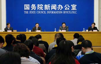Xie Xuren (L, 2nd), director of the State Administration of Taxation, gives a press conference sponsored by the State Council Information Office, Beijing, Jan.17,2006. [Xinhua Photo]