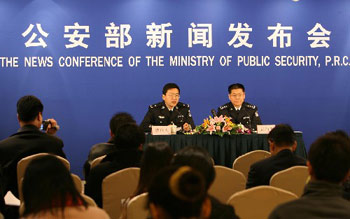 Fan Jingyu (L) , deputy head of personnel department of the Ministry of Public Security (MPS), answers questions at a press conference held in Beijing on February 23, 2006. [Xinhua Photo]