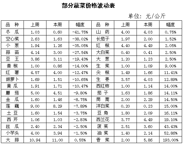 另外白蘿卜、韭菜、蒜薹等11種蔬菜繼續保持上上周平均批發價格。