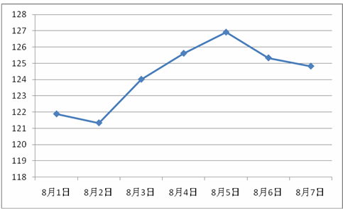 ¡@¡@¥»´Á¡]8¤ë1¤é¡X8¤ë7¤é¡^½µæ»ù®æ©P«ü¼Æ³ø124.23¡AÀô¤ñ¤U¶^0.48%¡C©Pªì¤é«ü¼Æ³ø121.88¡A©P¥½¤é«ü¼Æ³ø124.82¡A¤ñ©Pªì¤Wº¦2.94ÂI¡Aº¦´T2.41%¡C±q¹Ï1¤W¬Ý¡A¤W©P½µæ»ù®æ¤é«ü¼Æ§C¶}°ª¨«¡A§e¤W¤ÉÁͶաC