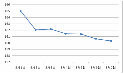 ¡@¡@¥»´Á¡]8¤ë1¤é¡X8¤ë7¤é¡^¤ôªG»ù®æ©P«ü¼Æ³ø157.51¡AÀô¤ñ¤U¶^7.66%¡A©Pªì¤é«ü¼Æ³ø164.99¡A©P¥½¤é«ü¼Æ³ø160.31¡A¤ñ©Pªì¶^4.68ÂI¡A¶^´T2.84%¡CÁaÆ[¡]¹Ï2¡^¡A¤W©P¤ôªG»ù®æ«ü¼Æ§e³æÃä¤U¶^ªº¨«¶Õ¡C