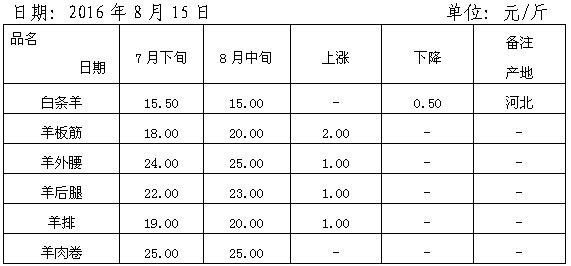 市場監測到的白條羊及羊副產品類的價格與7月下旬比較波動幅度在2.75元/斤左右,銷量較為穩定。具體上漲下降幅度如下圖所示: