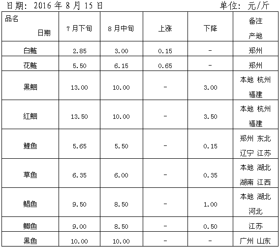 市場上監測到的魚品種中,價格與7月下旬比較波動幅度在2.15/斤,銷量穩中有升,銷量較好的品種為草魚、鯉魚、鯽魚。具體上漲下降幅度如下圖所示: