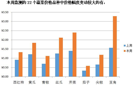 豆角環比上漲109.09%、尖椒環比上漲80.43%、茄子環比上漲78.26%、芹菜環比上漲71.43%、絲瓜環比上漲68.18%、青椒環比上漲61.22%、黃瓜環比上漲51.76%、西紅柿環比上漲45.31%,價格均大幅上漲,原因:1、季節因素:立秋後氣溫逐漸下降,地產蔬菜生長速度緩慢,應季蔬菜品種和數量都在減少,市場蔬菜供應量大幅下降,呈現供不應求的現象,造成價格上漲。2、像豆角、茄子、絲瓜、黃瓜、西紅柿此類本地蔬菜已過生長周期,市場供應量逐漸減少,開始由外地蔬菜替代,由于長途運輸,造成價格上漲。