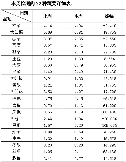 山東金鄉縣凱盛國際農產品物流園信息統計服務中心(8月8日—8月14日)對22種蔬菜進行監測顯示,上周蔬菜平均價格為2.77元/公斤,與上上周蔬菜平均價格2.41元/公斤相比,環比上漲14.61%,平均價上漲。上周蔬菜成交量為305.32萬公斤,與上上周相比,環比下降5.39%,成交量下降;交易額為845.74萬元,與上上周相比,環比上漲8.74%,總成交額上漲。