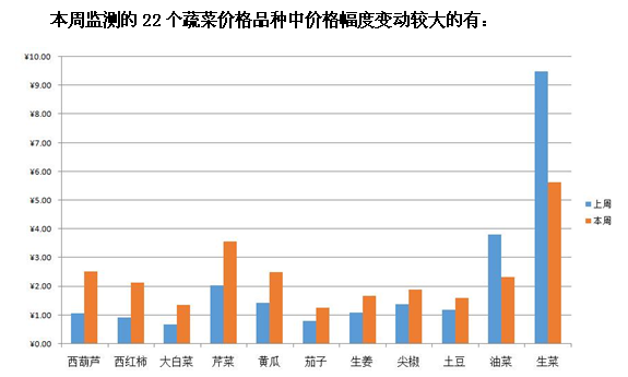 西葫蘆環比上漲139.19%、西紅柿環比上漲132.81%、大白菜環比上漲102.13%、芹菜環比上漲74.13%、黃瓜環比上漲73.27%、茄子環比上漲57.14%、生姜環比上漲55.26%、尖椒環比上漲37.50%,土豆環比上漲33.33%,價格陡升, 原因:1、季節因素:秋季到來,氣溫逐漸轉涼,已不再適應夏季蔬菜的生長,夏季蔬菜開始逐漸退出市場,市場供應量嚴重不足,帶人們對此類蔬菜的需求並未減弱,造成供不應求的局面,造成價格陡增。2、秋季蔬菜雖然已經上市,但產量明顯不如夏季蔬菜高,且種植面積少,品類單一。3、隨著部分學校的陸續開學,對于蔬菜的需求量開始上升,但蔬菜的上市量卻逐步減少,故價格上漲。