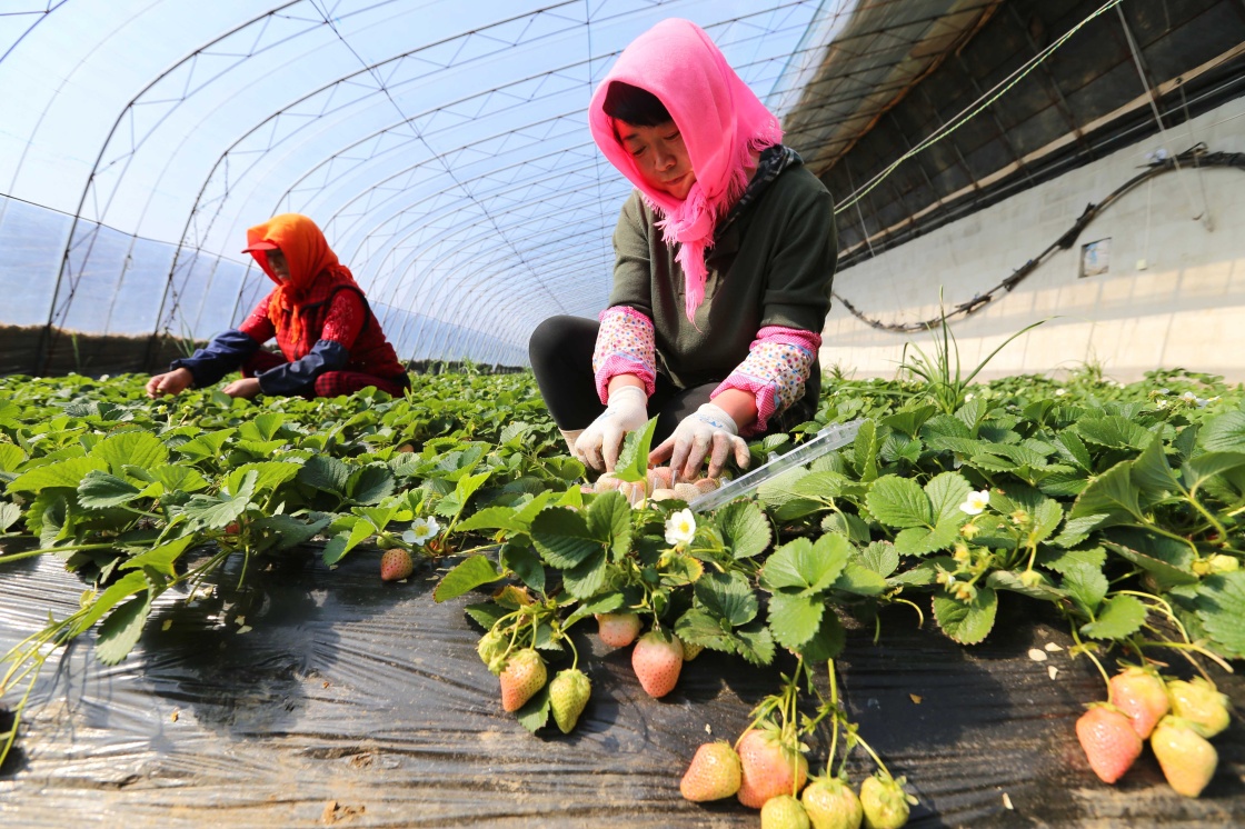 3月12日,在遼寧大連金普新區登沙河街道,農戶張艷秋(左)、趙麗在採摘“白草莓”。