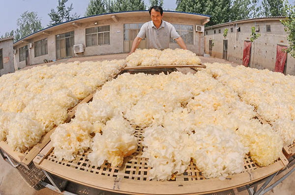 5月11日,河北省廣宗縣大柏社村農民在晾曬銀耳。