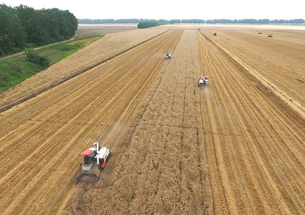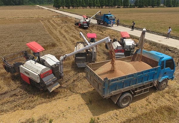5月25日,在安徽省廬江縣白湖農場,農用收割機在麥田搶收小麥。