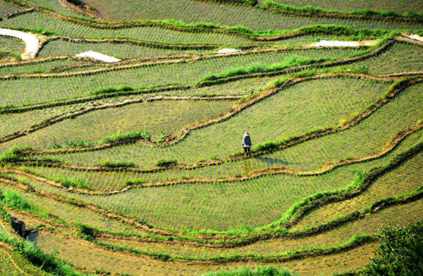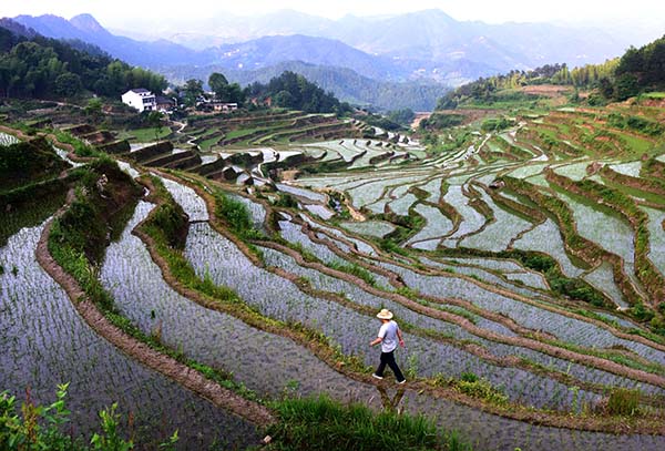 6月4日,一位村民在蘄春縣霧雲山村的梯田間勞作。