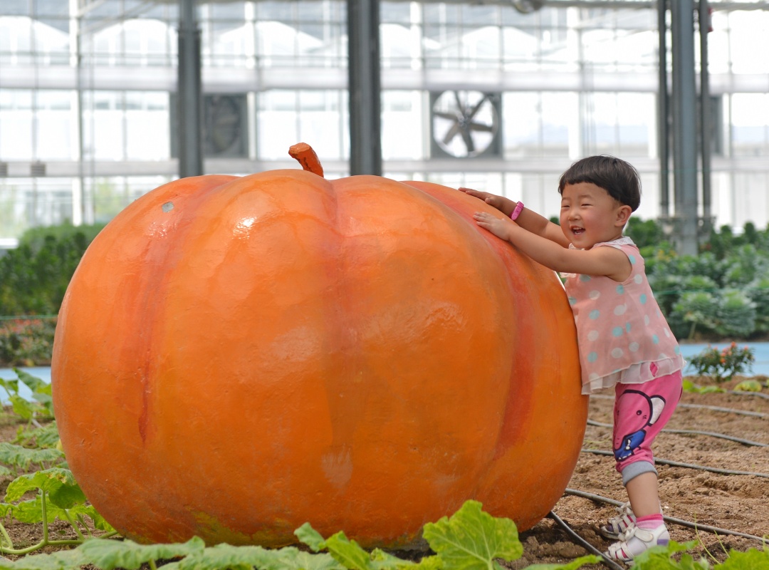 6月9日,一名兒童在南和縣“農業嘉年華”巨型南瓜模型前玩耍。
