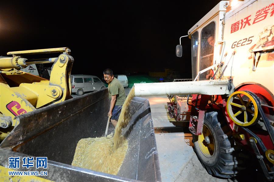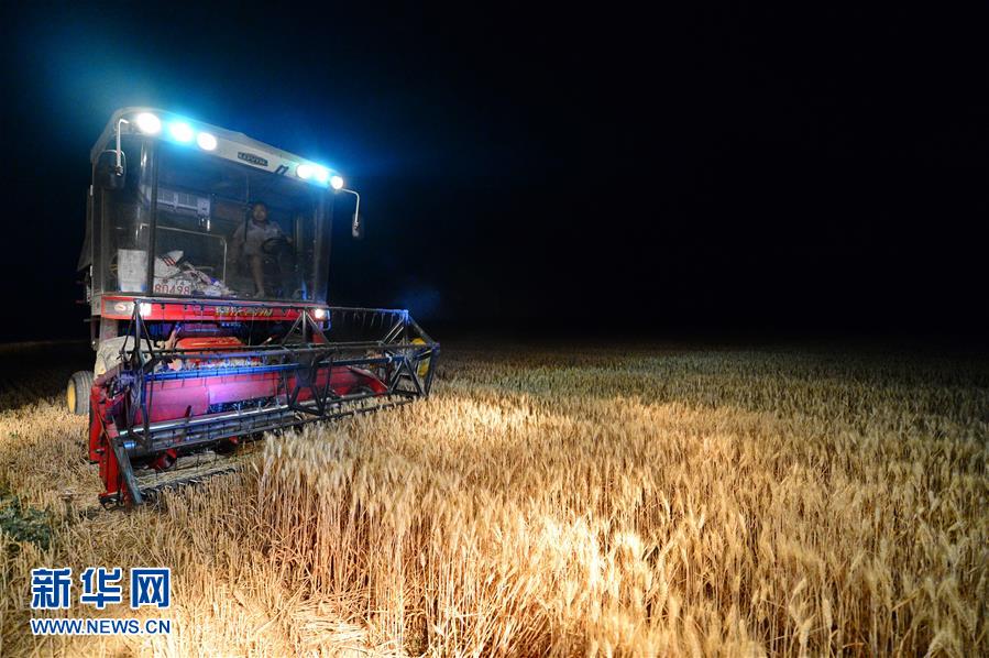 6月13日夜,在河間市時村鄉南馬灘村,收割機在搶收小麥。時下正值麥收季節,河北中部部分地區出現雷雨天氣,糧食產區的農民緊抓降雨間歇,連夜搶收小麥。 新華社記者 朱旭東 攝