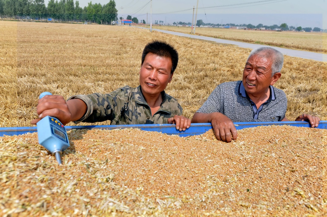 河北省邢臺市開發區留村鎮林義合作社的農民在測量收獲小麥的水分(6月13日攝)。
