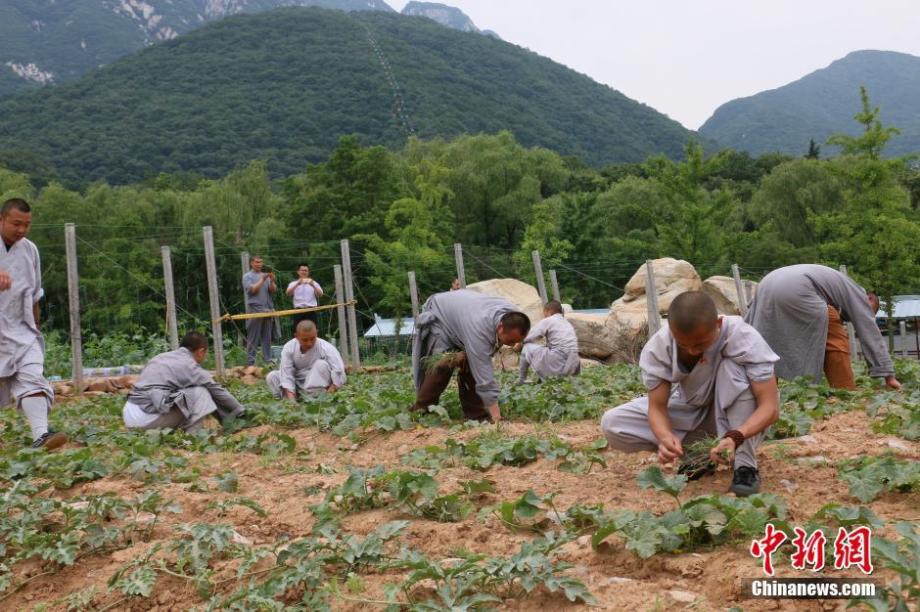 少林寺塔林南側,少林禪耕菜園里一片蓊蓊鬱鬱,僧眾菜園里除草忙。岳龍 攝