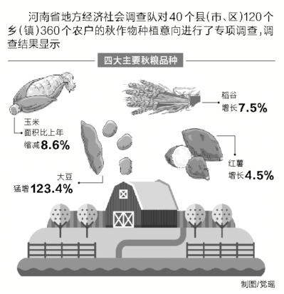 近日,河南省地方經濟社會調查隊對40個縣(市、區)120個鄉(鎮)360個農戶的秋作物種植意向進行了專項調查,調查結果顯示,四大主要秋糧品種玉米面積比上年縮減8.6%,大豆猛增123.4%;稻谷、紅薯分別增長7.5%和4.5%。