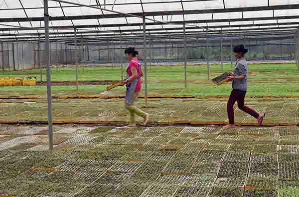 6月20日,茨營鎮團結村的兩名女工在蔬菜苗圃大棚搬運幼苗。
