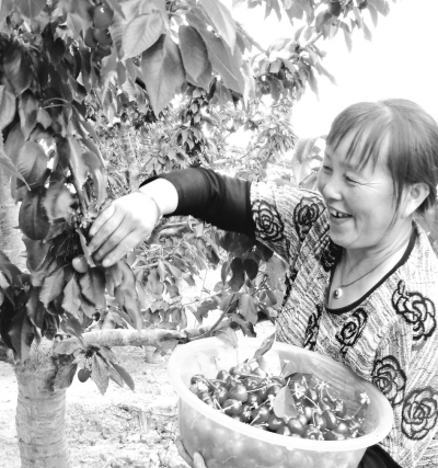 新疆兵團九師167團種植的大櫻桃喜獲豐收。該團去年引進大櫻桃,每棵櫻桃樹結果30多公斤,深受市場青睞,預計收入達10萬元以上。圖為職工在採摘櫻桃。 劉葉攝