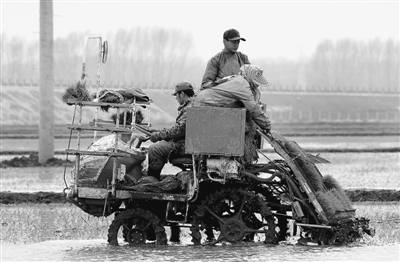 近日,在黑龍江農墾857農場,水稻大戶用高速插秧機插秧。李敘根攝