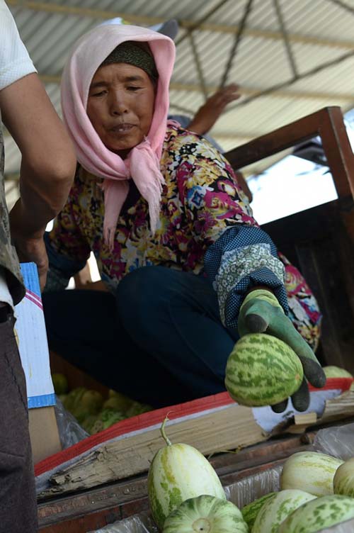 6月29日,在寧夏海原縣關橋鄉馮灣村西甜瓜基地,農戶在挑選甜瓜。