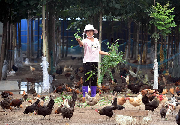 6月28日,別古莊村林鑫農民合作社的農民在用槐樹葉喂散養柴雞。