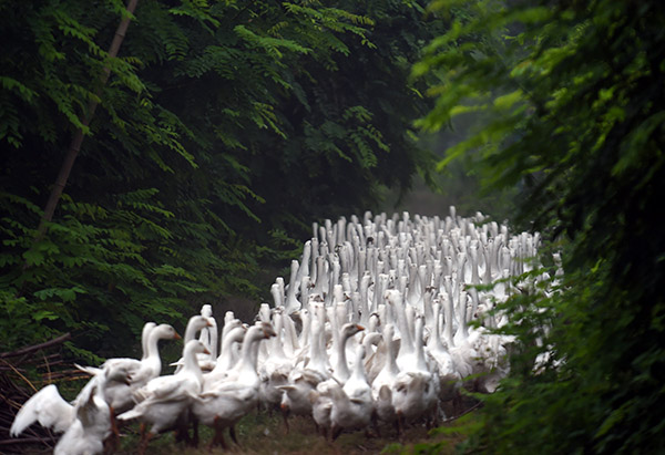 6月28日,別古莊村林鑫農民合作社的白鵝在大葉速生槐林中散養。