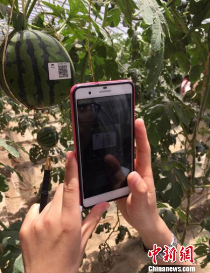 7月3日,甘肅榆興生態農業科技開發有限公司種植園區內,一位媒體記者用手機掃描西瓜上的二維碼,查看農產品的種植信息。 丁思 攝