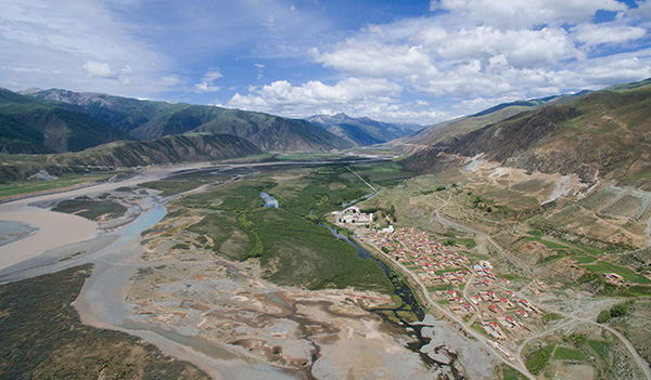 俯瞰石渠縣正科鄉金沙江畔一段河流濕地(7月3日攝)。