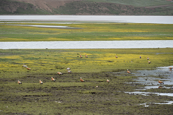 一群赤麻鴨在石渠縣太陽湖濕地里棲息(7月1日攝)。