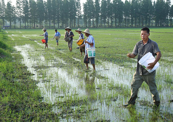 7月27日,江蘇宜興市徐舍鎮佘圩村種田大戶范國良(右一)組織農民對補種的300多畝水稻施肥。