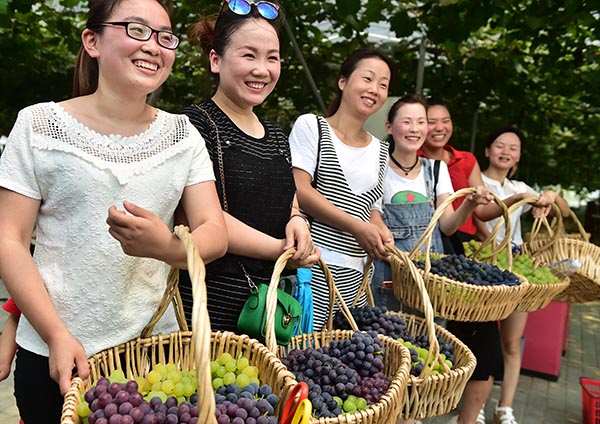 正值葡萄成熟時節,安徽合肥市包河區大圩鎮1.1萬畝葡萄種植園向遊客開放,眾多市民來到葡萄園享受採摘的樂趣。據了解,今年大圩鎮葡萄總產量達2.5萬噸,共有30多個品種供遊客選擇採摘。新華社記者 劉軍喜 攝