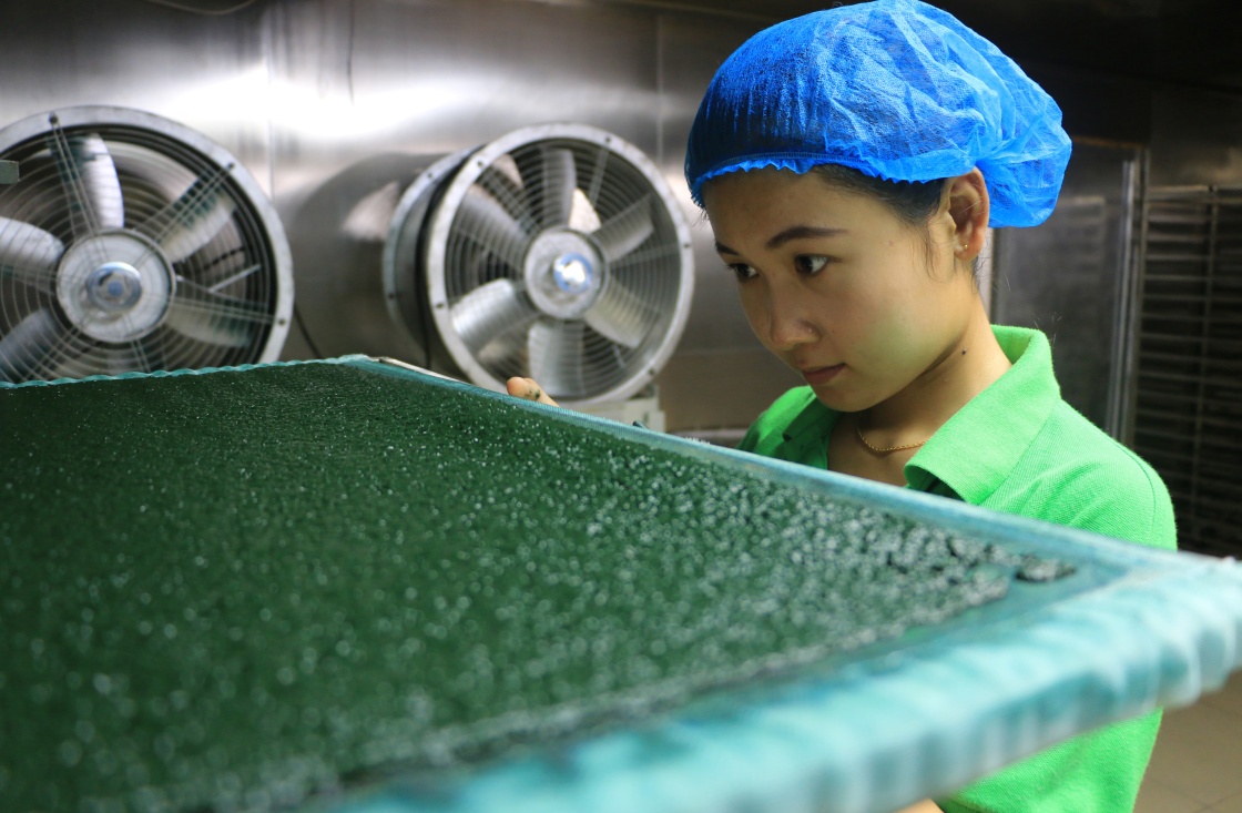 8月3日,在山東省鄒城市香城鎮螺旋藻養殖基地,技術人員劉敬蘭觀察鮮藻烘幹情況。