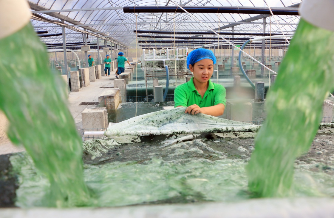 8月3日,在山東省鄒城市香城鎮螺旋藻養殖基地,工作人員清理藻池。