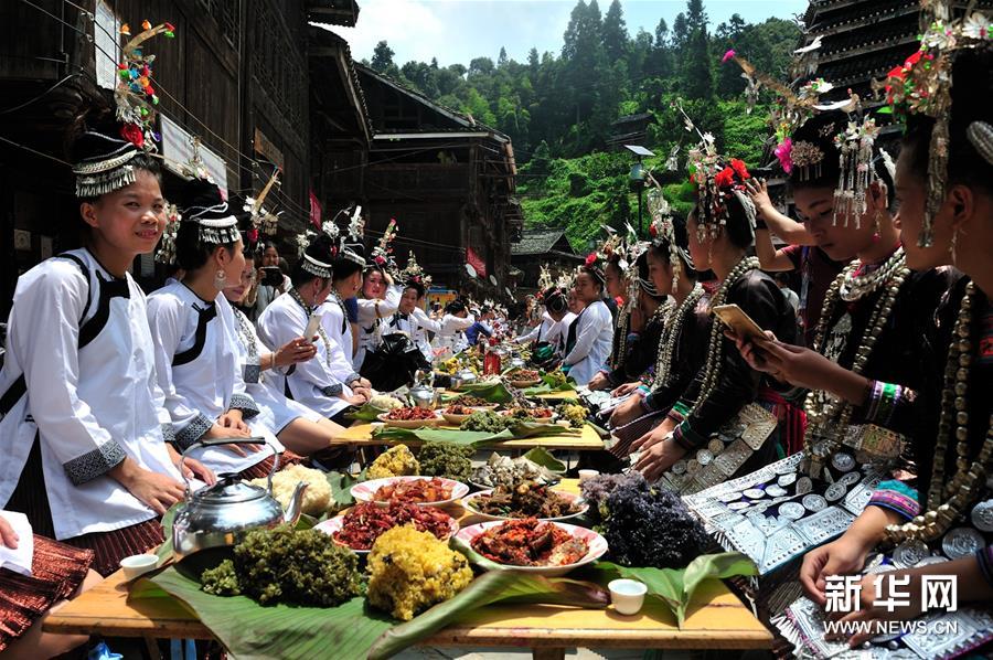 8月9日是貴州省從江縣銀潭侗寨一年一度的新米節,人們殺豬宰牛,開展侗族民俗表演、蕩秋千、唱侗歌等活動,並擺下侗家長桌宴,與賓客共度節日。新華社發(張琪攝)