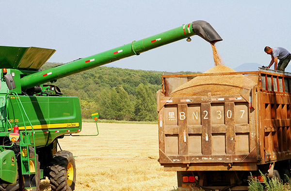 8月9日,黑河市大慶農場職工在裝運小麥。