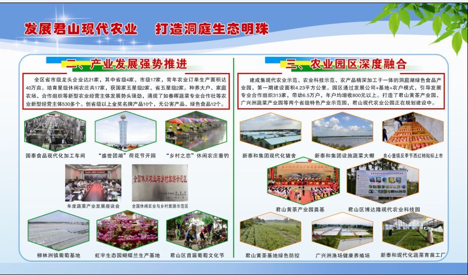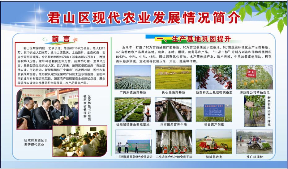 在農業生產、管理、服務和經營4個環節中充分融合互聯網,促使君山現代農業實現提質增效,道路也越走越寬闊。現在君山已擁有萬畝以上特色生產基地6個,6.6萬畝農產品生產基地獲國家無公害蔬菜和健康水產品產地認證,發展省市級龍頭企業22家、農民專業合作社255家、規模型休閒農莊28家、“三品一標”農產品23個,注冊農產品商標170件,榮獲省著名商標5件,農產品優質率達90%以上,該區也先後被確定為全國農產品加工業示范基地、全國休閒農業與鄉村旅遊示范縣(區)和全國農產品質量安全試點縣(區)。