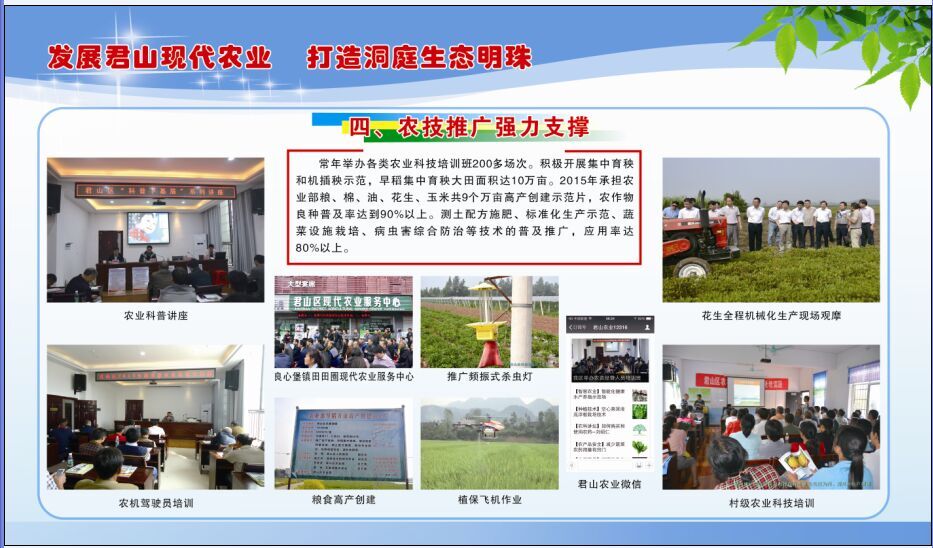 在利用互聯網的優勢加強了農產品銷售和監管問題後,君山區還把互聯網融入到農業生產和服務環節中。他們引進“田園牧歌”植保服務公司,通過互聯網大數據對全區農田的植保進行統防統治,對水肥進行精密計算,科學施用化肥農藥,讓農戶投入少,效果好,提高產品產量的同時也保障農產品質量。同時,該區農業部門還開設了“君山農業12316”微信公眾號,及時宣傳政府各類農業政策,適時發布對農業種植技術指導。並通過微信公眾號和朋友圈及時解決農戶在生產中遇到的各類問題。