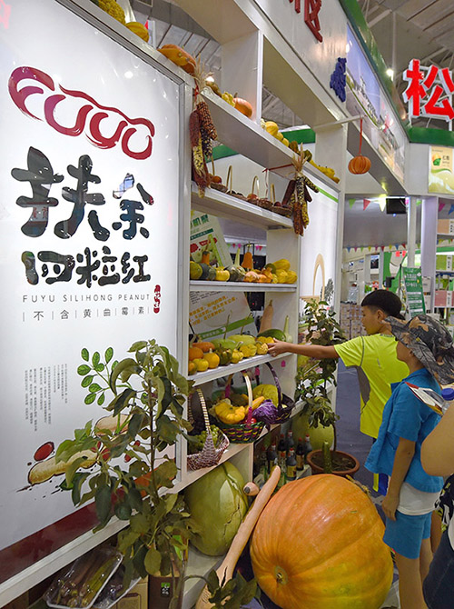 8月17日,在第十五屆長春農博會松原市展區,兩位小朋友參觀各式觀賞南瓜。