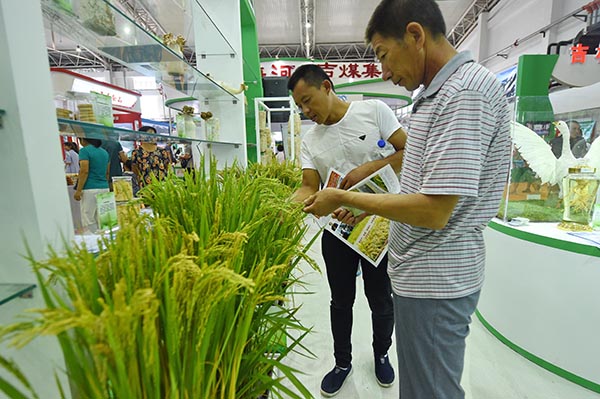 8月17日,兩位消費者在第十五屆長春農博會吉林農業大學展區參觀水稻良種。