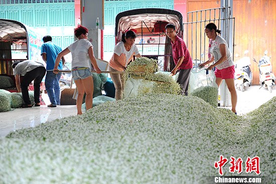 工人正在對收購的新鮮的茉莉花進行裝袋運往加工企業加工。