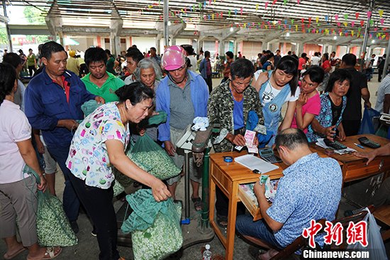 花農在廣西橫縣茉莉花交易市場內排隊將採摘的茉莉花販賣給茉莉花加工企業。