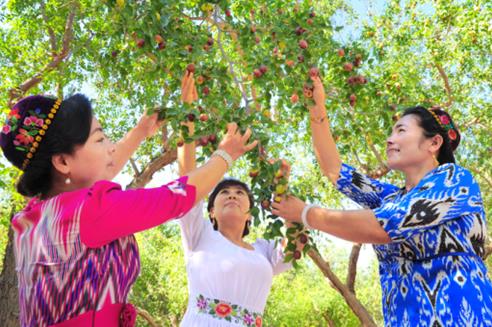 圖為哈密市五堡鎮高得格村維吾爾族婦女在採摘大棗。