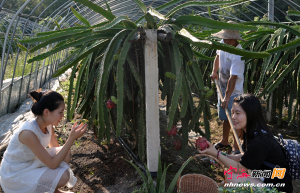 力洋鎮首家基地規模化種植的臺灣紅心火龍果已進入全盛期,一只只拳頭大的成熟果子似一簇簇火焰。偶爾還有幾只漂亮的孔雀在火龍果基地來回穿梭,煞是引人注目。每到周末,到該基地採摘火龍果和觀賞孔雀的市民絡繹不絕。
