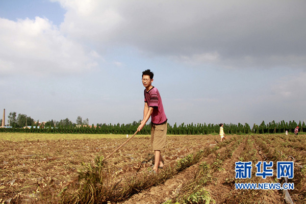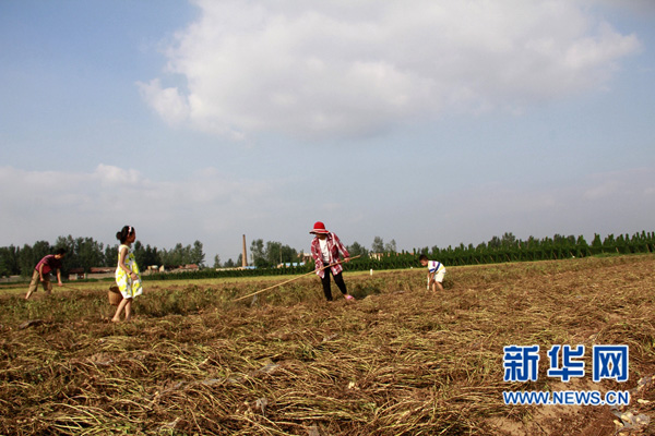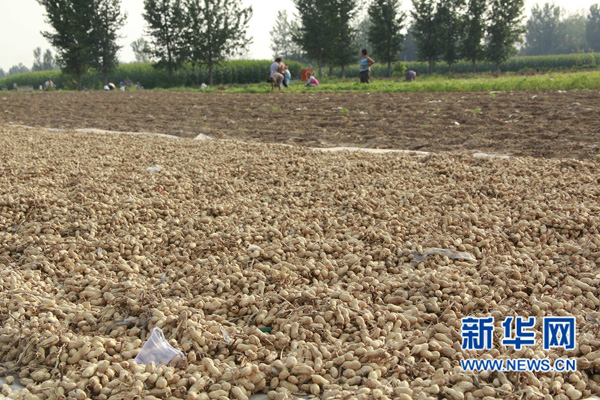 8月21日,內黃縣城關鎮的農民在晾曬花生。