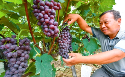 孟州市趙和鎮上寨村一品鮮葡萄種植專業合作社理事長孟慶進在採摘頭茬黑珍珠葡萄。該合作社種植葡萄120余畝,全部採用沼液追肥,不使用任何有害激素,開園後每天都吸引大批遊客前來購買生態葡萄。