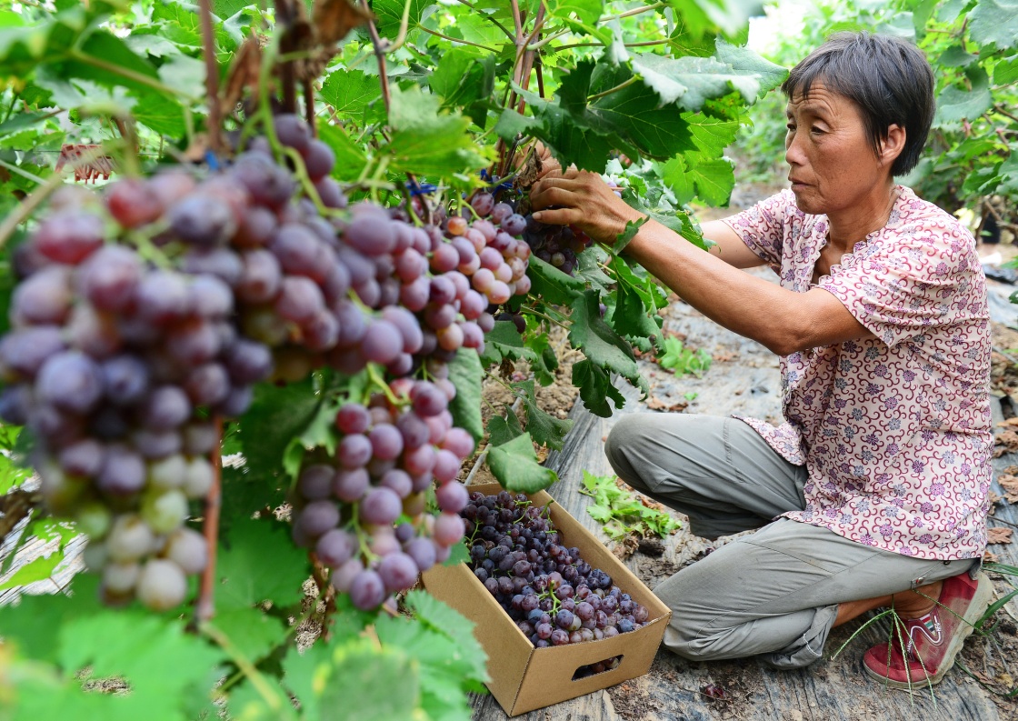 8月25日,河北省武邑縣張橋村農民在葡萄園採摘葡萄。
