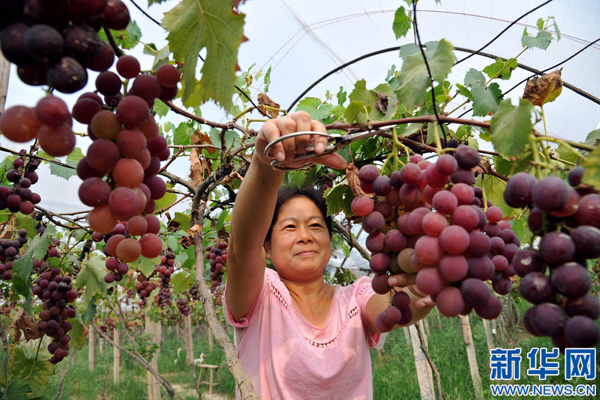 8月26日,萬載縣鵝峰鄉涂泉村有機蔬菜基地的果農在採摘葡萄。