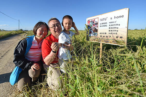 8月29日,一家來自北京的客戶在自家定制的稻田前留影。